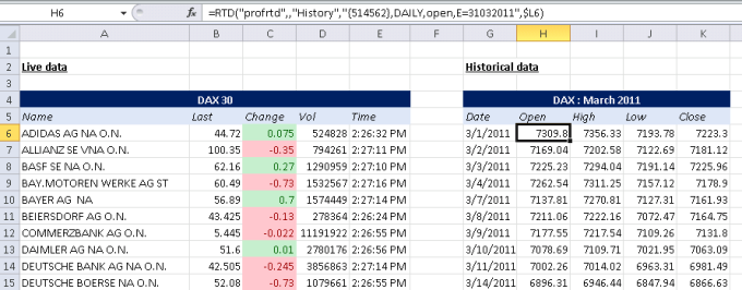 Mit RTD-Verknüpfungen zu aktuellen Daten können Sie ein große Auswahl an Feldern für ein Wertpapier abrufen, von ständig aktualisierten Kursdaten über Echtzeit-Markttiefe bis hin zu Fundamentaldaten (inkl. Unternehmensinformation und Kennzahlen). Siehe RTD-Verknüpfung mit aktuellen Daten erstellen.